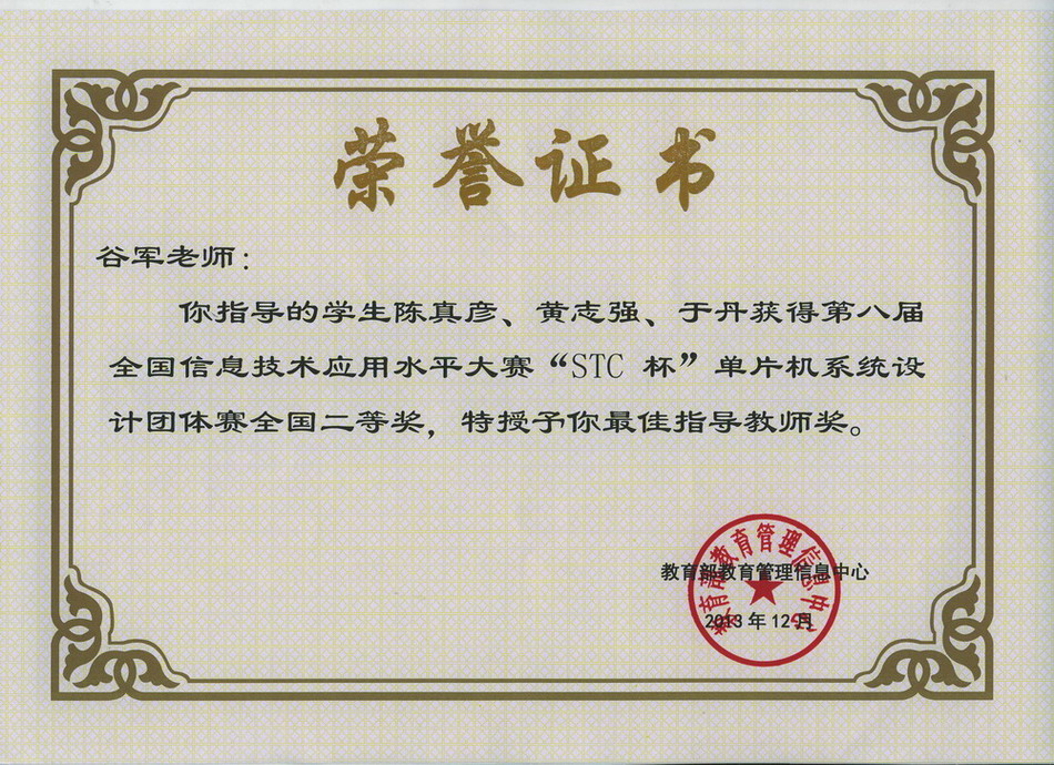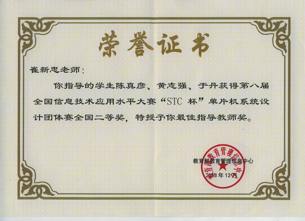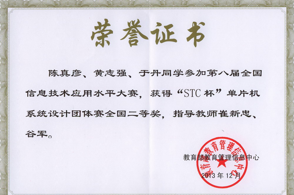 近日,由教育部教育管理信息中心主办的第八届全国信息技术应用水平大赛决赛在北京航空航天大学落下帷幕。全国共有来自31个省、自治区、直辖市的703所院校参赛,初赛团队总数为5467个,入围决赛代表队有884个。由我院崔新忠、谷军两位教师指导,自动化专业学生陈真彦、黄志强、于丹组成的Dreamers代表队完成的作品《智能家居系统》获得单片机系统设计团体赛全国二等奖的优异成绩。崔新忠、谷军被授予“最佳指导教师”的荣誉称号。