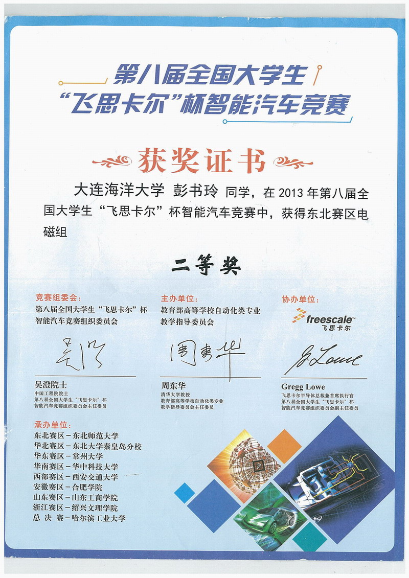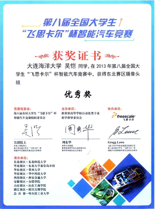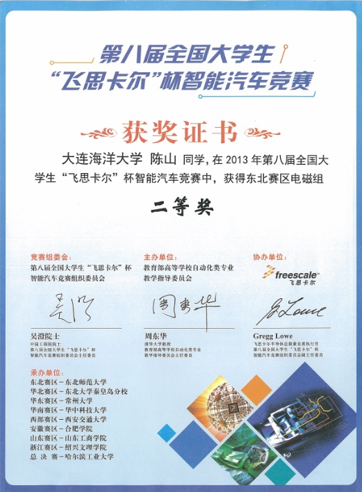 近日,第八届全国大学生“飞思卡尔”杯智能汽车竞赛东北赛区比赛成绩揭晓。我院参赛的2支代表队获奖。其中,由梁策老师指导,学生黄小龙、陈山、彭淑玲组成的代表队获得“电磁组”东北赛区二等奖,学生徐凯、吴恺、牛爱组成的代表队获得“摄像头组”优秀奖。