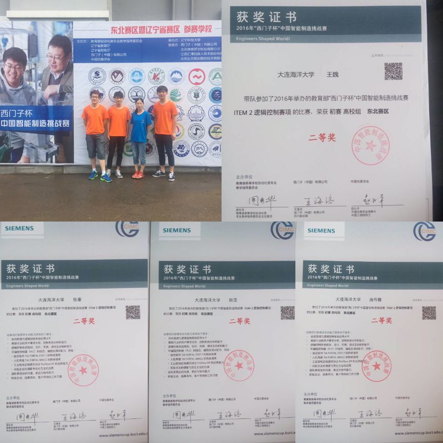 7月21日至7月24日,由教育部高等学校自动化类专业教学指导委员会,西门子(中国)有限公司,中国系统仿真学会共同主办的2016年“西门子杯”中国智能制造挑战赛圆满结束。由教师王魏指导,学生张康、耿浩、曲传馥组成的逻辑控制参赛队获得东北赛区二等奖、辽宁省二等奖。由教师崔新忠指导,学生兰爱玉、常诚、杨菲组成的工程创新参赛队获得华北赛区二等奖。