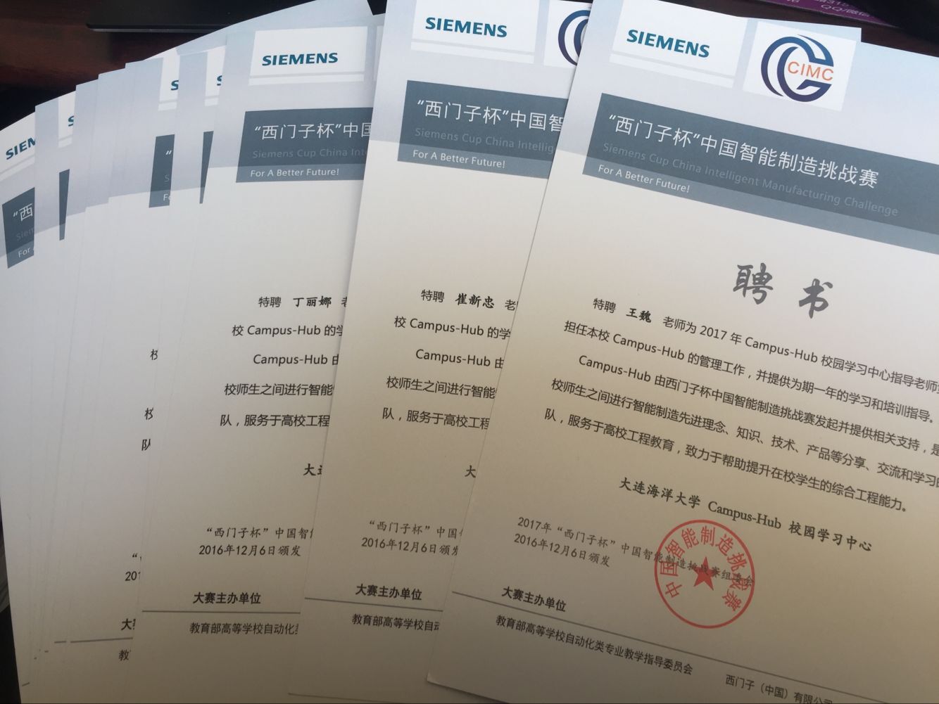 “西门子杯”中国智能制造挑战赛(原全国大学生工业自动化挑战赛)组委会为增强高校学生对工业技术的热爱,更好地帮助老师和同学们参与、完善大赛,在全国各大高校设立Campus-Hub校园学习中心。经申请,我校于12月6日通过审批并获得证书,设立Campus-Hub校园学习中心,指导教师负责人王魏、缪新颖、崔新忠、丁丽娜等获发中心指导教师聘书,学生负责人张康获得聘书。
