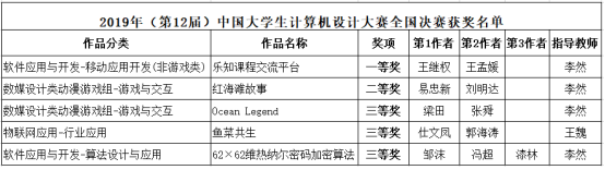 由教育部高等学校大学计算机课程教学指导委员会、中国大学生计算机设计大赛组织委员会联合主办的“2019年(第12届)中国大学生计算机设计大赛”全国总决赛分别于8月8-11日在安徽师范大学、8月18-21日在杭州电子科技大学举行了软件应用与开发类、物联网应用类、数媒动漫游戏类决赛。全国有近500所院校参加,是中国高等教育学会指定的34个全国大学生学科竞赛之一。我校由信息工程开元(中国)李然老师带队,派出5支代表队参加比赛,参赛选手在赛场上沉着冷静、奋力拼搏,经过激烈角逐,首次在该项赛事中实现“一等奖”零的突破,斩获一等奖1项、二等奖1项、三等奖3项。特别是在大赛闭幕式上的优秀作品点评环节,我校选手积极发言交流,展现了海大学子的实力和风采,受到与会专家和师生的好评。