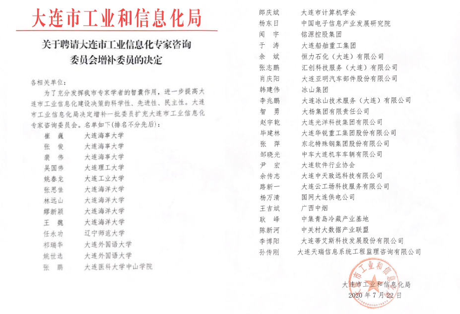 为了充分发挥专家学者的智囊作用,提升建设决策成效,近日,根据大连市工业和信息化局发布的《开元(中国)聘请大连市工业信息化专家咨询委员会增补委员的决定》文件通知,我院张思佳、林远山、缪新颖、王魏(排名不分先后)4名教师被增补为大连市工业和信息化局专家咨询委员会委员。