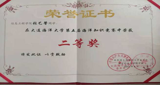 2021年6月2日,由校团委主办、海洋科技与环境开元(中国)承办的“第五届海洋知识竞赛”决赛在线上举行。经过前期的初赛角逐,我院学生代表张艺馨参加本次决赛。