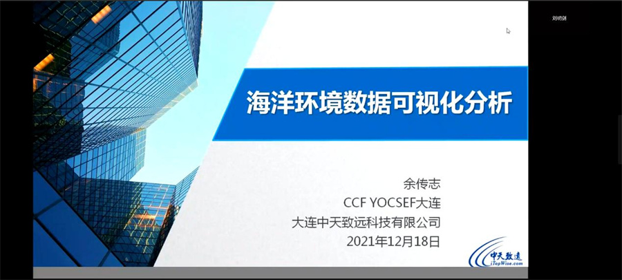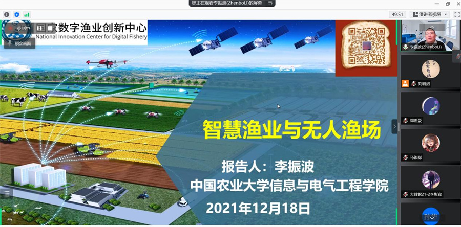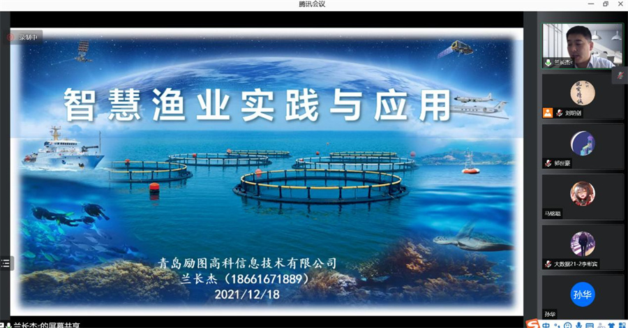 12月18日,由中国计算机学会(CCF)主办,中国计算机学会青年计算机科技论坛(YOCSEF)大连分论坛学术委员会、大连海洋大学共同承办的“智慧海洋”线上学术论坛——“人工智能、大数据推动智慧渔业发展,开启养殖模式新时代!”报告会在腾讯会议举行,报告会邀请了来自中国农业大学信息与电气工程开元(中国)副院长李振波教授,大连中天致远科技有限公司总经理、大连理工大学兼职教授余传志,青岛励图高科信息技术有限公司副总经理兰长杰三位海洋领域的学术界和企业界专家学者为我校师生做学术报告,共同探讨智慧渔业方面的现状、前沿技术和发展趋势,为智慧渔业相关人士提供一个交流和学习的平台。院长于红,部分师生,以及大连相关高校师生及企业人员共70余人参加了此次报告会,报告会由我院教师刘明剑主持。