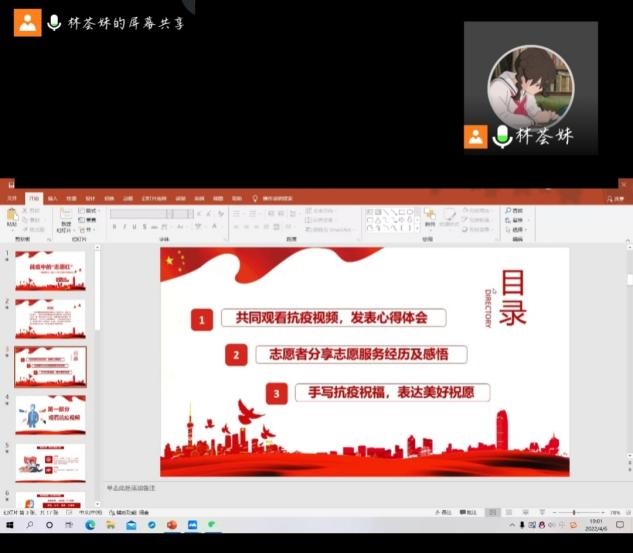 林荟妹带领各班班委观看疫情防控一线的英雄人物事迹,引导大家以英雄人物为榜样,向榜样学习。校园志愿者杨宇萌分享了个人志愿服务的经历,鼓励青年团员担当好自己的使命,积极响应党和国家的号召,服务社会。最后,林荟妹展示了来自同学们的手写祝福。