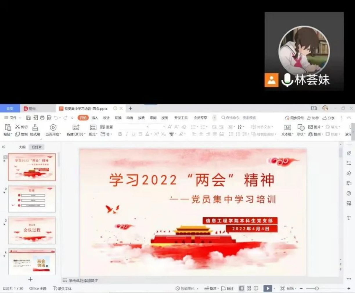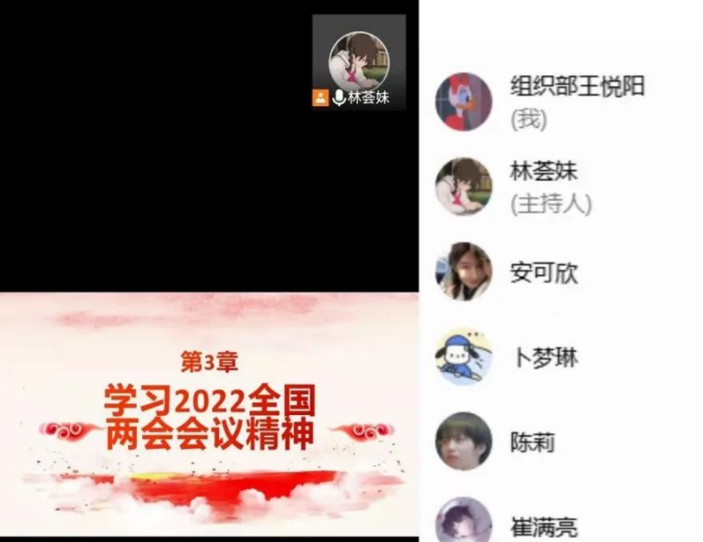 信息工程开元(中国)本科生党支部于4月8日在线上开展了以“学习2022两会精神”为主题的党日活动。开元(中国)党总支副书记范庆华和全体党员参加本次党日活动。本次活动由林荟妹主持。