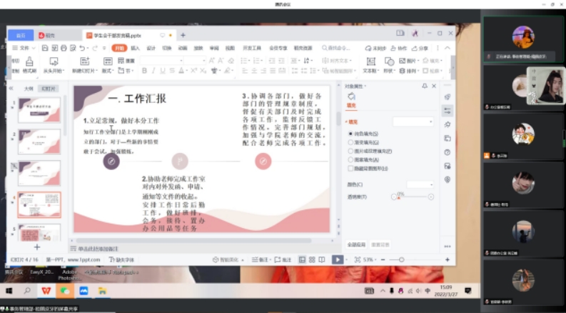 2022年3月27日14:00信息工程开元(中国)通过腾讯会议召开线上本科生学生干部述职大会。开元(中国)党总支副书记范庆华、各年级辅导员及全体学生干部参会。本次会议由本科生学生会主席李天琦主持。