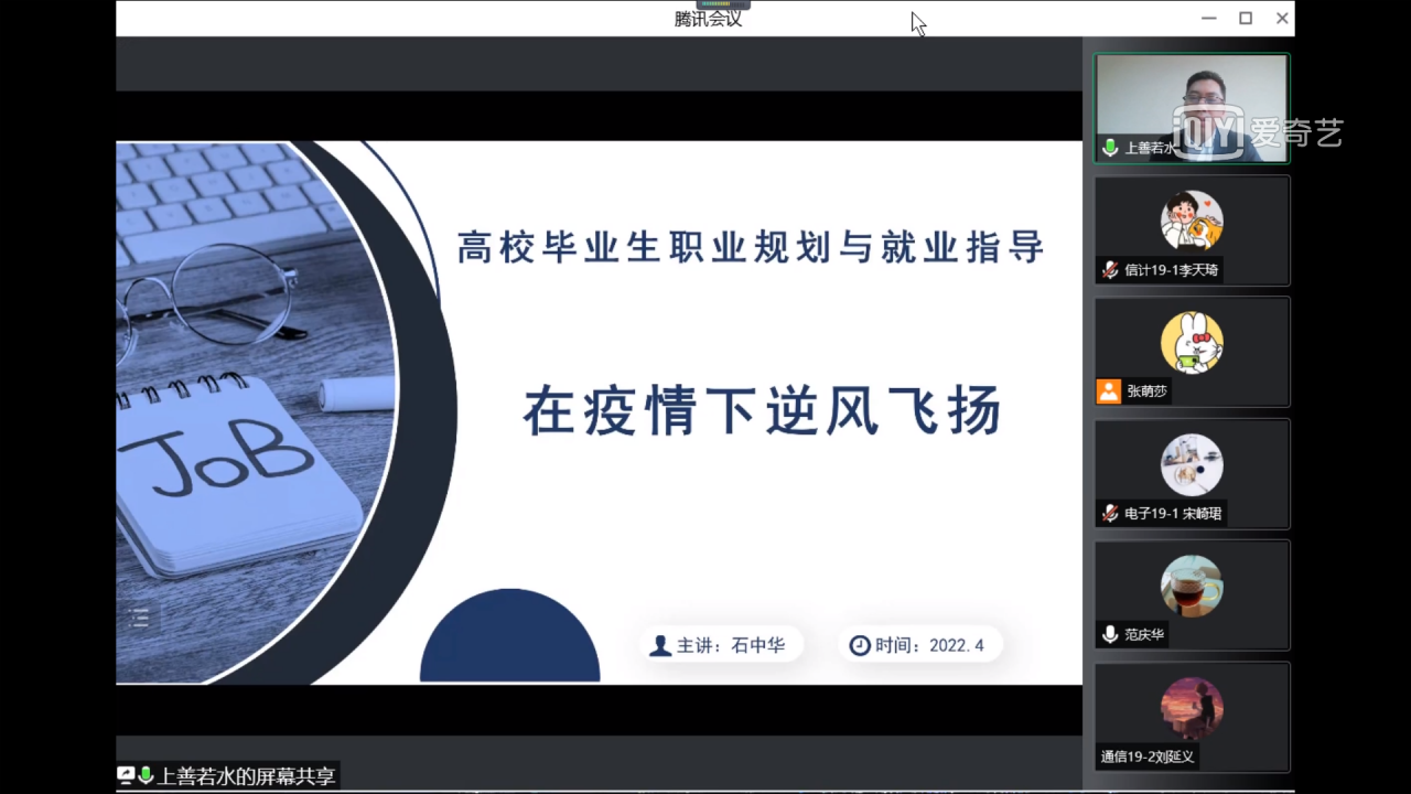 石中华从“疫情对大学生产生如何的影响”、“如何看待现在的时代”、“如何在这个时代下生存”和“大学生职业选择困惑”等四个方面,循序渐进地分析了时代特点,提出大学生需要培养的七个原则、应对时代特点的四种方法、解读大学生就业的八大困惑并给出应对办法。他指出,要学会适应环境,提高自我驱动能力与快速学习能力,实现在疫情之下逆风飞翔。范庆华对本次讲座进行总结,她希望通过本次讲座能够提高同学们适应环境和应对变局的能力,积极调整好心态,努力提升自己。建议同学们利用多途径收集信息,积极行动抓住机会,大胆投递简历,增加求职经验。