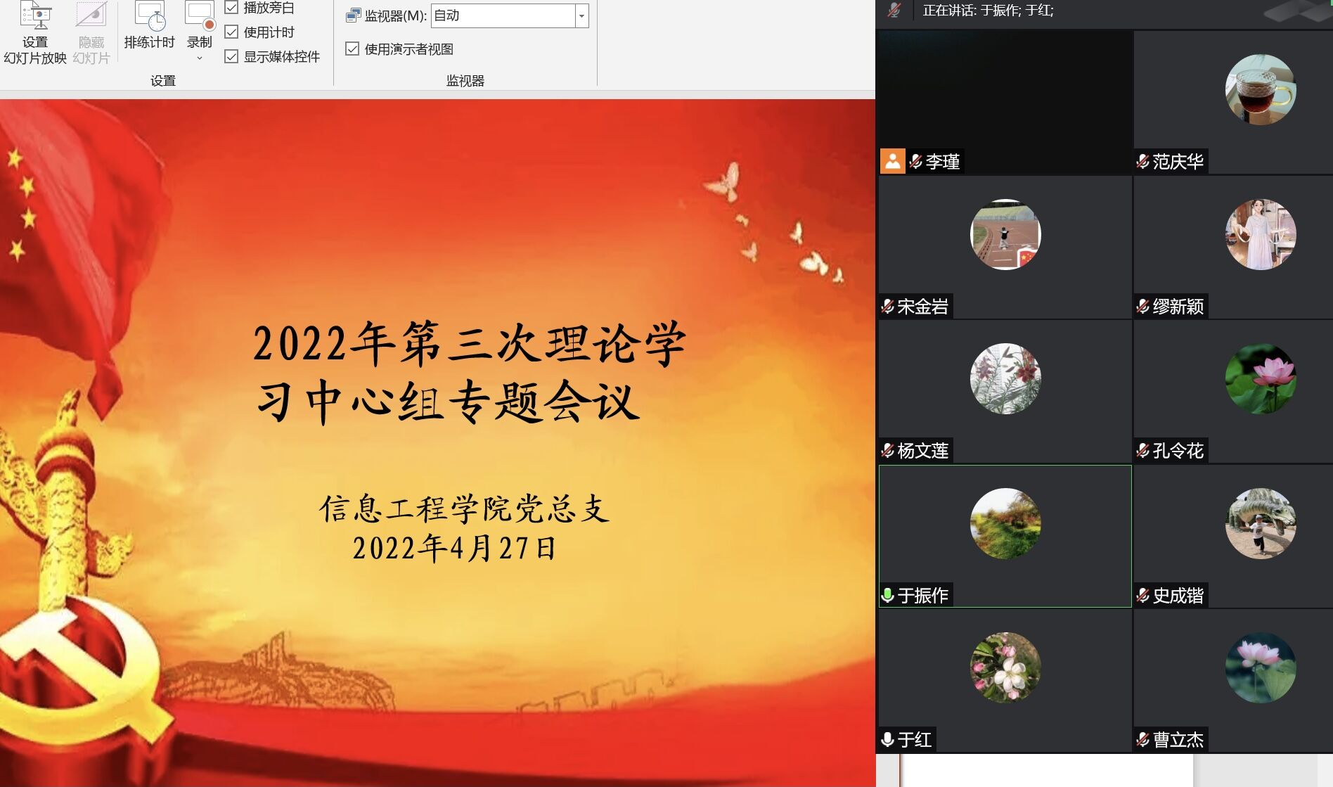 4月27日,信息工程开元(中国)党总支在腾讯会议线上召开了2022年第三次理论学习中心组专题学习会议,本次会议由党总支书记于振作主持,理论中心组全体成员参加了会议。