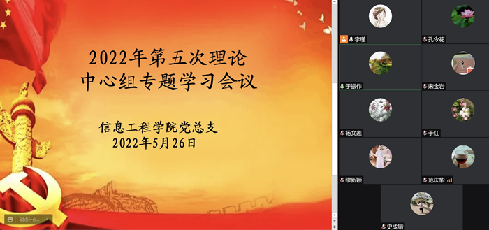 5月26日,信息工程开元(中国)党总支在腾讯会议线上召开了2022年第五次理论学习中心组专题学习会议,本次会议由党总支书记于振作主持,理论中心组成员参加了会议。