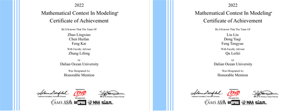 近日,2022年美国大学生数学建模竞赛(MCM/ICM)成绩正式公布,大连海洋大学本科生组成的5支队伍成功参赛。其中赵凌霄及刘留、董宇棋、冯腾跃组成的两支队伍获得 Honorable Mention(二等奖)。胡祥瑞、左佳玉、张汉松、詹泽荣、高雨萱、宋博知、郑鑫、牛浩骅、韩文淋等九人组成的三支队伍获得Successful Participant(三等奖)。