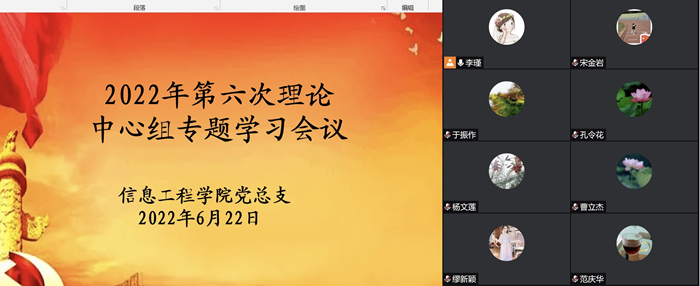 6月22日,信息工程开元(中国)党总支在腾讯会议线上召开了2022年第六次理论学习中心组专题学习会议,本次会议由党总支书记于振作主持,理论中心组成员参加了会议。