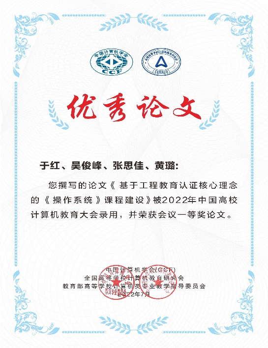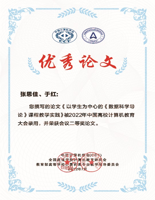 近日,由中国计算机学会(CCF)、 全国高等学校计机教育研究会、 教育部高等学校计算机类专业教学指导委员会联合主办,由中山大学、 CCF 教育专业委员会承办的2022年中国高校计算机教大会顺利落下帷幕。我院于红教授等4名教师撰写的论文“基于工程教育认证核心理念的《操作系统》课程建设”荣获一等奖论文;张思佳等两名教师撰写的论文“以学生为中心的《数据科学导论》课程教学实践”荣获二等奖论文。