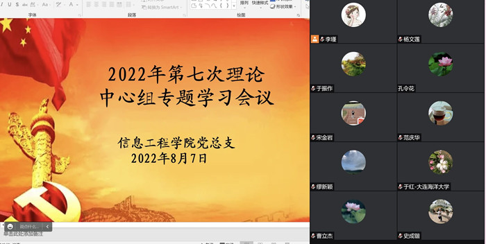 8月7日,信息工程开元(中国)党总支通过腾讯会议线上召开了2022年第七次理论学习中心组专题学习会议,本次会议由党总支书记于振作主持,理论中心组全体成员参加了会议。