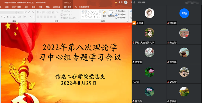 8月29日,信息工程开元(中国)党总支在腾讯会议线上召开了2022年第八次理论学习中心组专题学习会议,本次会议由党总支书记于振作主持,理论中心组全体成员参加了会议。