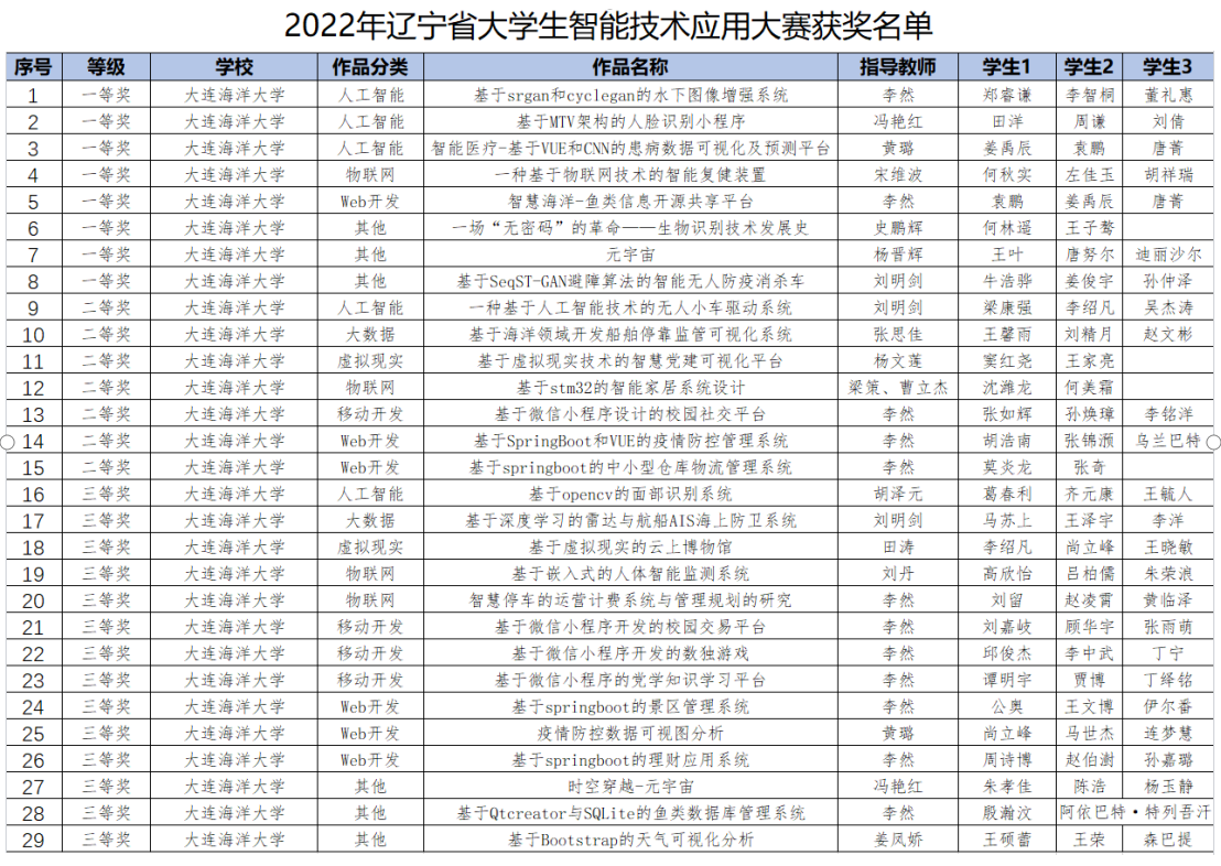 近日,2022年首届辽宁省大学生智能技术应用大赛落下帷幕,本次比赛有51所学校参与,共评选出一、二、三等奖573件,优秀组织单位20所。