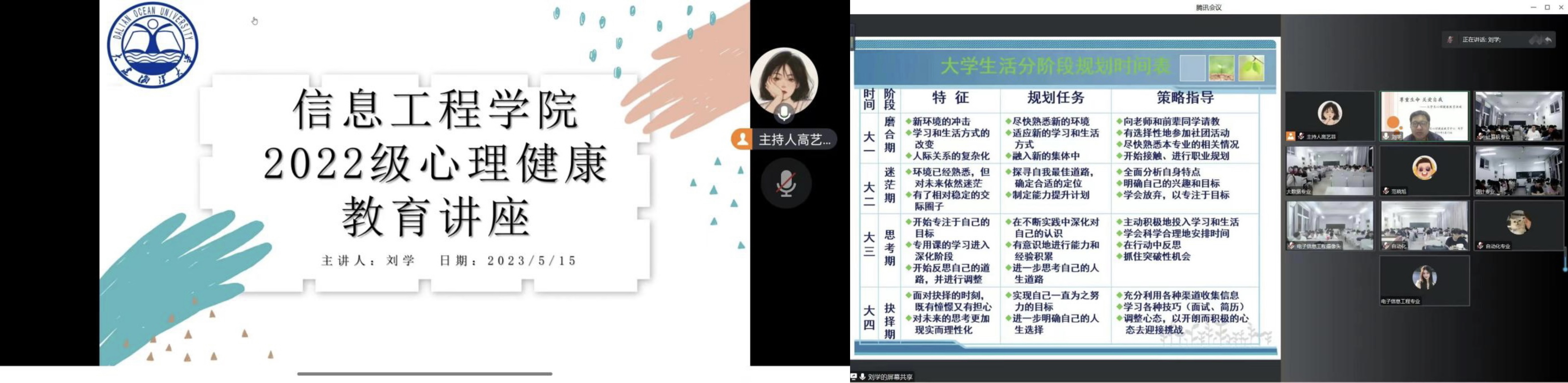 为帮助同学们学会关爱自我,了解自我,接纳自己,进而关注自己的心理健康和心灵成长,提高自身心理素质。信息工程开元(中国)于2023年5月15日18:40召开心理健康教育讲座,本次讲座由心理健康中心刘学老师主讲,高艺菲主持,2022级全体学生聆听讲座。