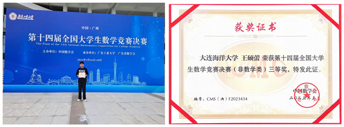 据悉,第十四届全国大学生数学竞赛由中国数学会主办、广东工业大学承办,其中初赛已于2023年3月结束,我院17人参加数学专业B比赛,获得国家一等奖1人,二等奖1人,三等奖1人,省三等奖1人。辽宁赛区非数学类学生共有8000多人参赛,其中代表辽宁省参加决赛的共有15名学生。