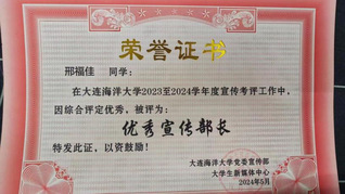 2024年5月9日,我校召开了大连海洋大学大学生新媒体中心宣传工作表彰大会,我院获评大连海洋大学2023至2024年度“优秀宣传组织单位”。