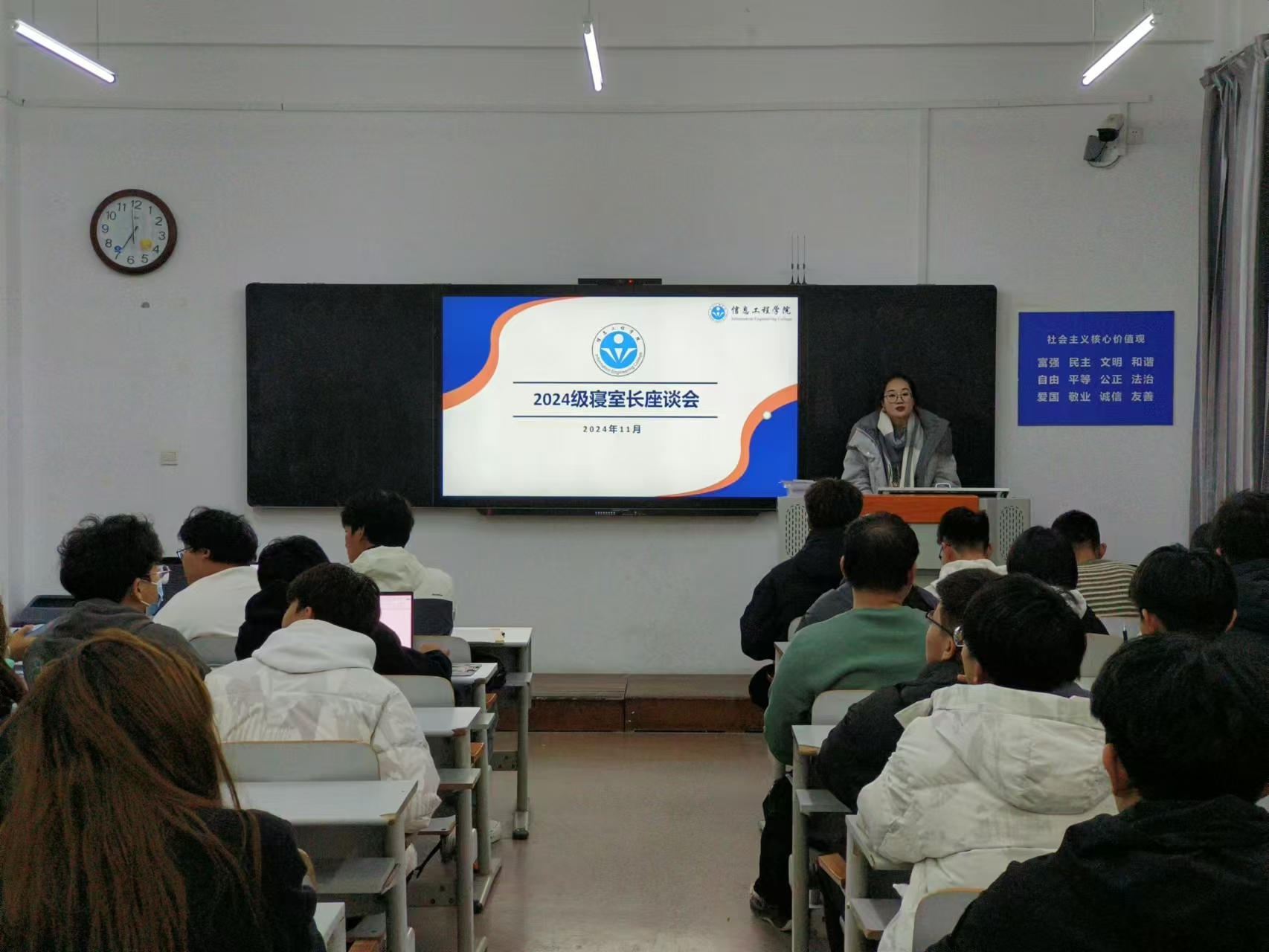 为加强新生的宿舍自我管理能力,提升寝室长责任感与寝室文化氛围,进一步推动校园安全文化建设。信息工程开元(中国)于2024年11月28日在獐子岛教学楼520教室开展2024级寝室长座谈会。2024级辅导员艾柳君以及2024级全体寝室长参加。会议由艾柳君主持。
