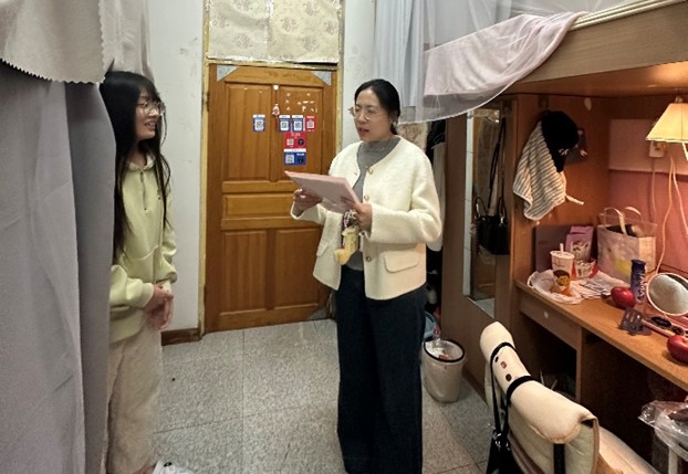 走访过程中,汪淼带着满满的关心以及慰问品走进宿舍。她耐心询问同学们的学习、生活情况,倾听他们的学习困惑、生活烦恼和未来规划。此外,对宿舍的卫生状况、安全设施等情况进行了深入细致地检查。