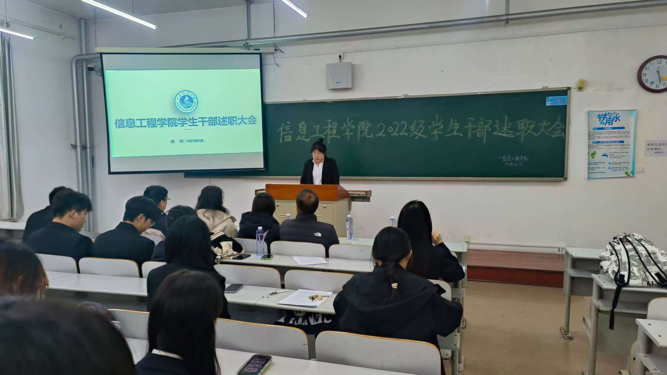 为总结过去一学期的工作成绩与经验,查找不足,明确2025年新的工作方向和思路。信息工程开元(中国)于近期在獐子岛教学楼104教室召开学生干部述职大会。信息工程开元(中国)党委副书记于洋、团委书记修恒哲、各年级辅导员、全体学生干部参会。会议由高艺菲主持。