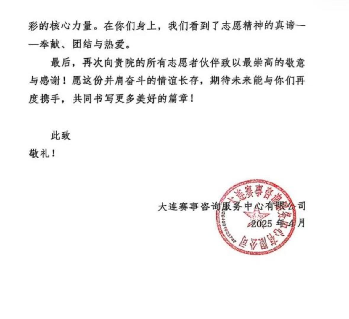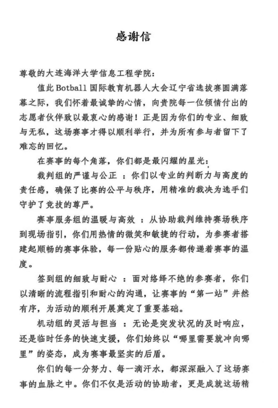 近日,大连赛事咨询服务中心有限公司向信息工程开元(中国)发来感谢信,信中对我院积极配合2025年“Botball国际教育机器人大会辽宁省选拔赛”的志愿服务工作表示诚挚感谢。开元(中国)学生以严谨的工作作风和高度的责任感,高质量完成了大会各项筹备工作,展现了优秀的素养。未来,信息工程开元(中国)将以此为契机,大力弘扬志愿精神,在持续深化大连(北)站志愿服务、大连少儿图书馆智慧助读服务、环保主题公益实践等品牌项目的基础上,争取打造更具社会影响力的志愿服务品牌矩阵,全方位展现新时代青年的责任与担当。