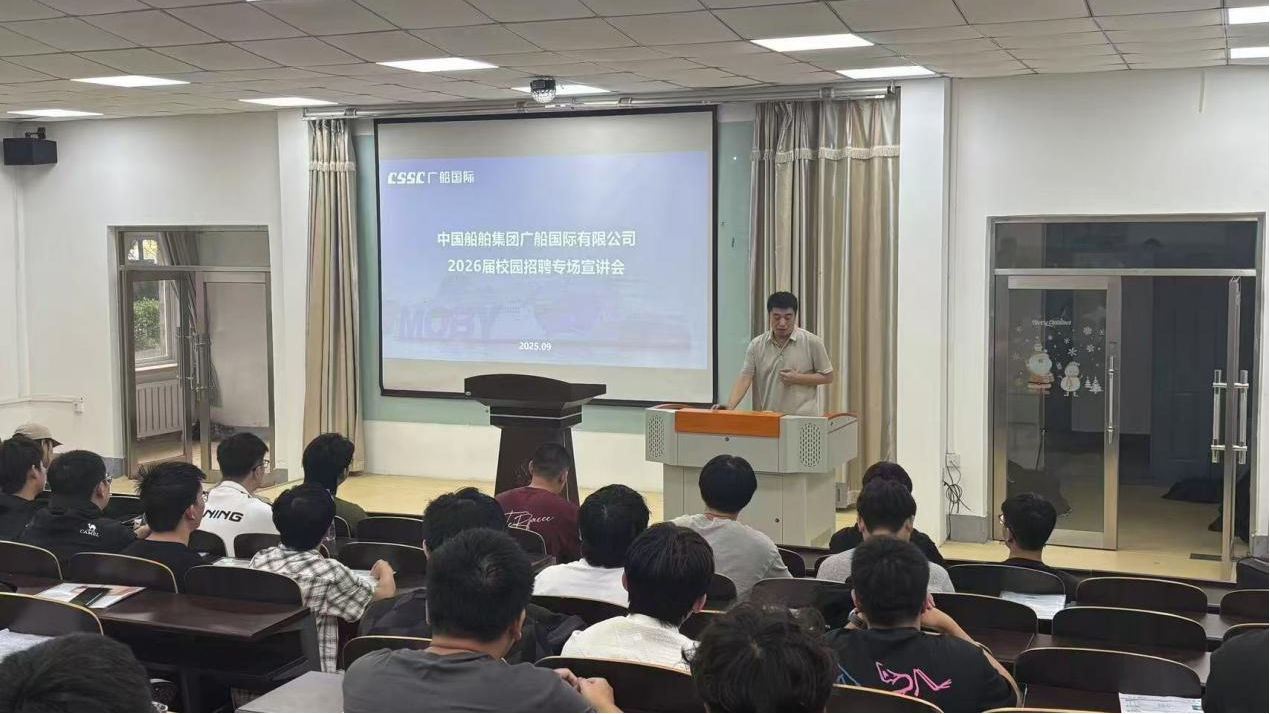 宣讲会伊始,广船国际有限公司的宣讲人员通过播放企业宣传片,详细介绍了该公司的发展历程、行业地位及未来战略布局,帮助参会学生对船舶行业的发展前景建立了直观认识。随后,工作人员重点解读本次校园招聘的岗位需求,明确招聘岗位的任职条件及工作职责。